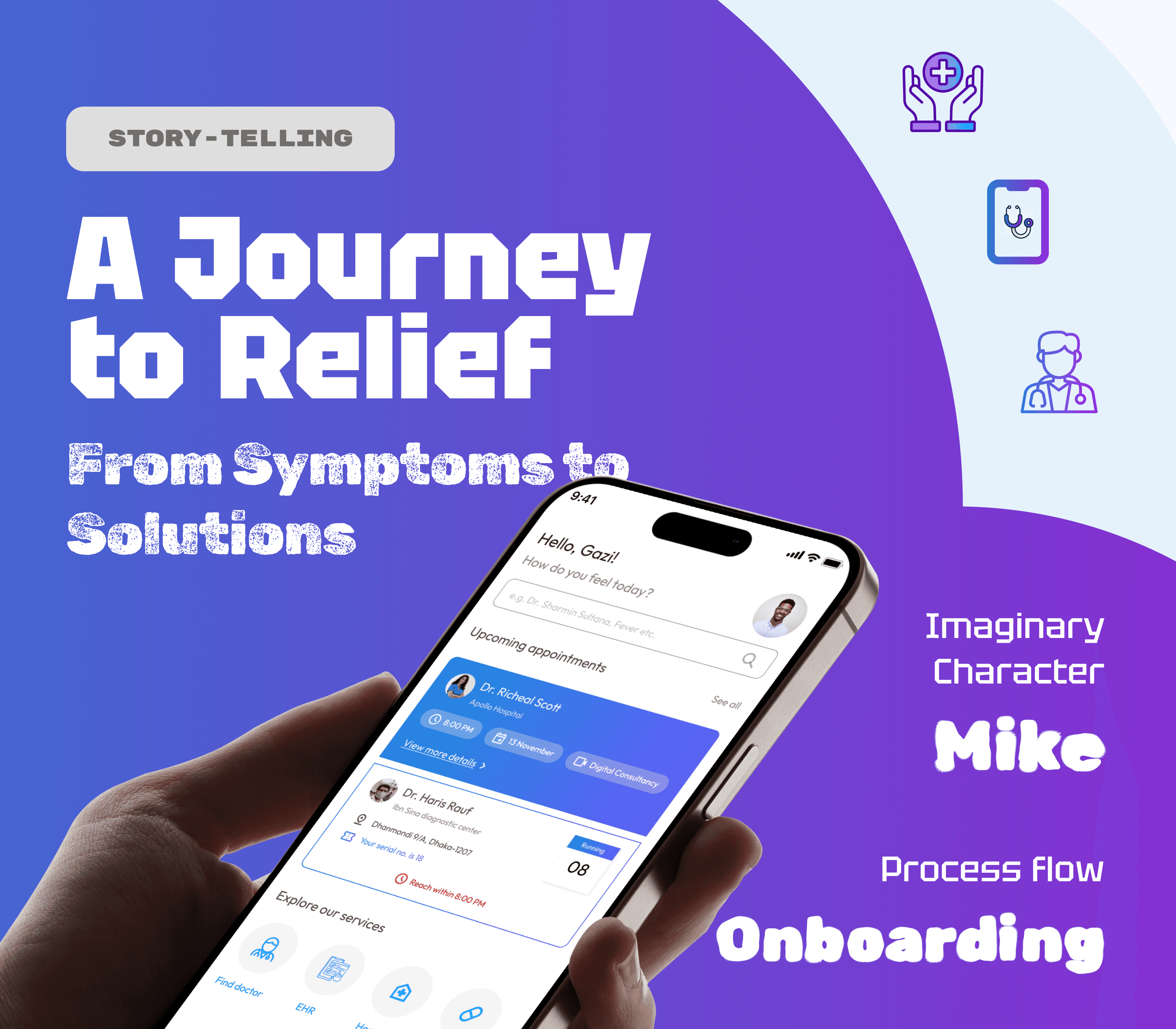 This is one of my favorite project. Here I have tried to build a unique case study rather than the traditional one. In this, an imaginary character is sharing his experience while going through a telemedicine mobile app to appoint a doctor for his consultancy. From the beginning, I had a dream to establish something start-up in health-tech. So, that’s a way to start the thing.